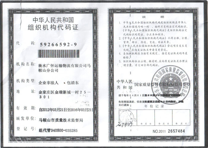 衡水广怀运输物流有限公司马鞍山分公司营业执照(正本) 衡水广怀运输物流有限公司马鞍山分公司营业执照(副本) 衡水广怀运输物流有限公司马鞍山分公司税务登记证 衡水广怀运输物流有限公司马鞍山分公司组织机构代码证